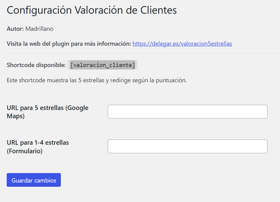 El plugin de Valoración de Clientes que hemos desarrollado desde Delegar.es aborda este reto de forma sencilla y efectiva. En nuestro WordPress creamos una página de valoración que nos mostrará 5 estrellas para que el cliente nos valore. Esa URL es la que compartimos con aquellos clientes que han quedado plenamente satisfechos y que quieren valorarnos.